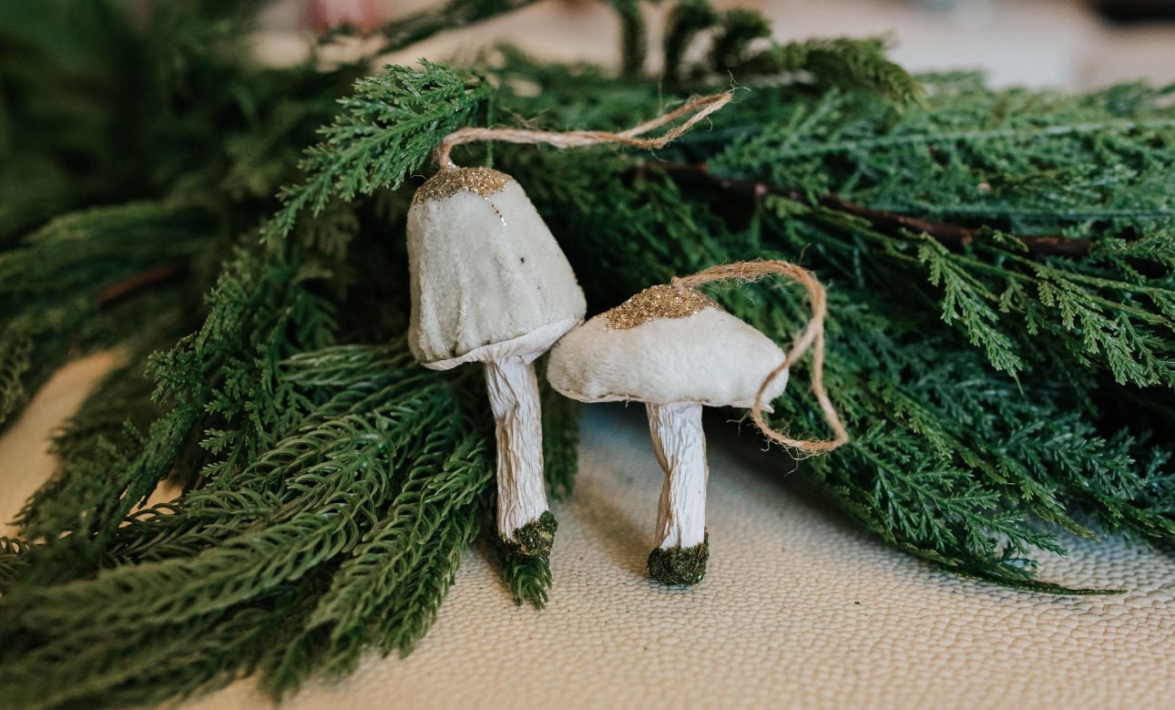 - Design: 2 assorted velvet mushroom ornaments with light green caps and natural paper stems