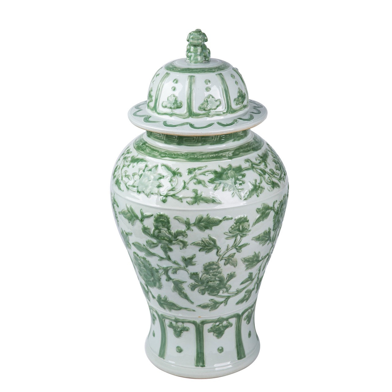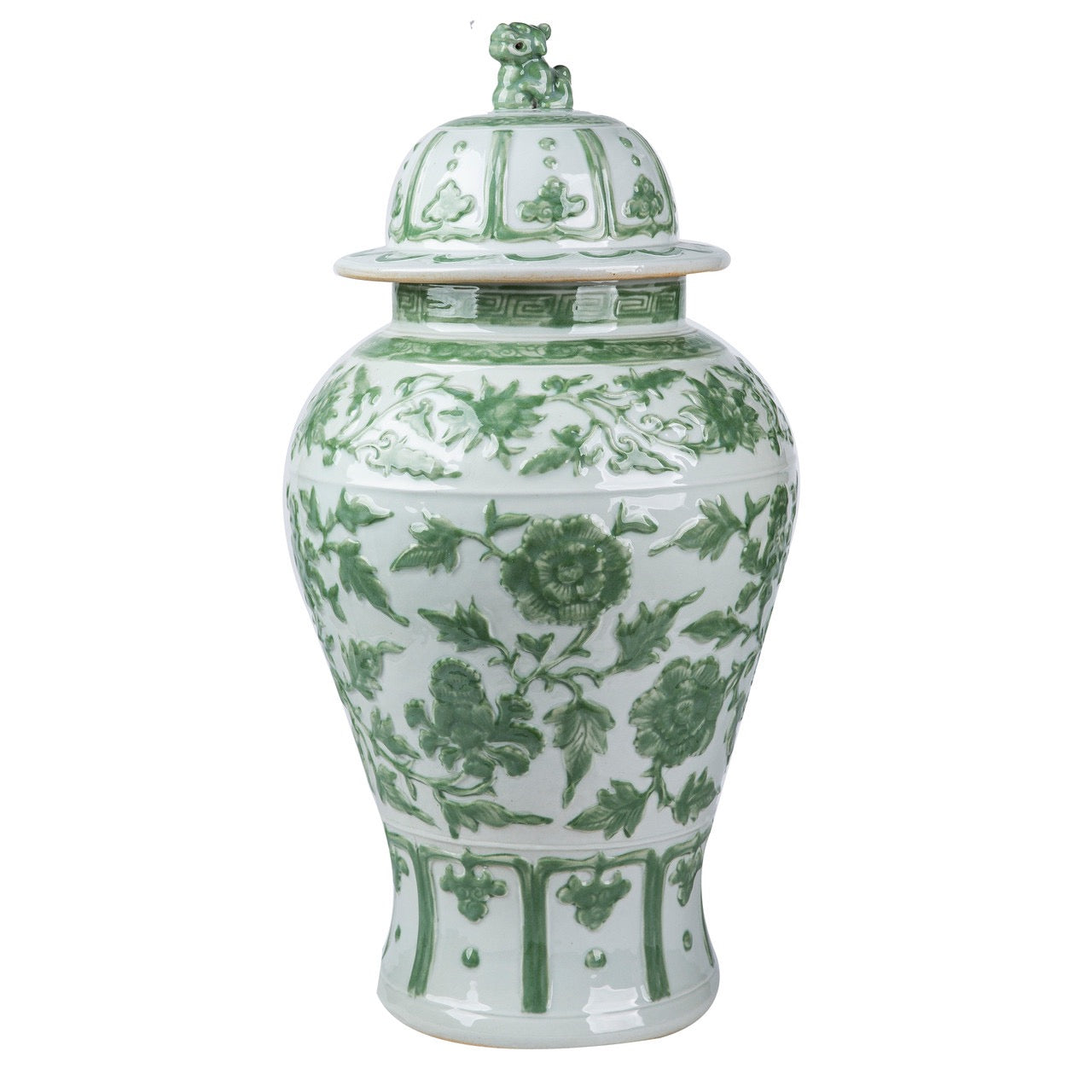Elevate your home’s elegance with this magnificent green and white embossed temple jar. Standing at an impressive 12 inches, this large porcelain ginger jar features intricate, raised floral carvings and a stately Foo Dog finial atop its matching lid. The vibrant green accents against the crisp white glaze create a sophisticated botanical aesthetic that perfectly blends traditional Chinoiserie with high-end luxury decor.