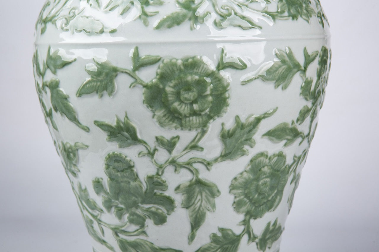 Color: White porcelain with vibrant green embossed floral motifs