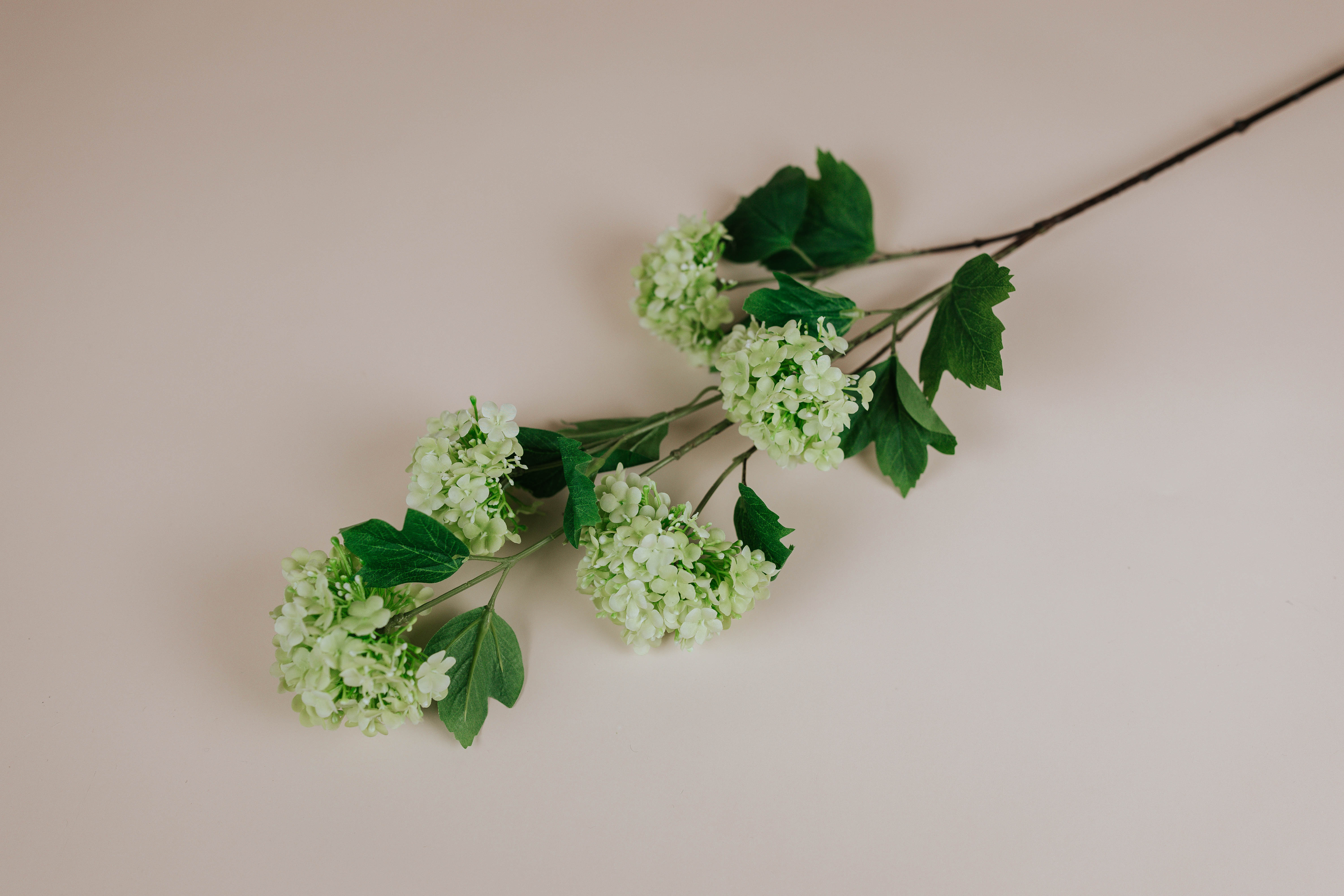 Design: Multiple large, spherical "snowball" blooms on a single architectural branch