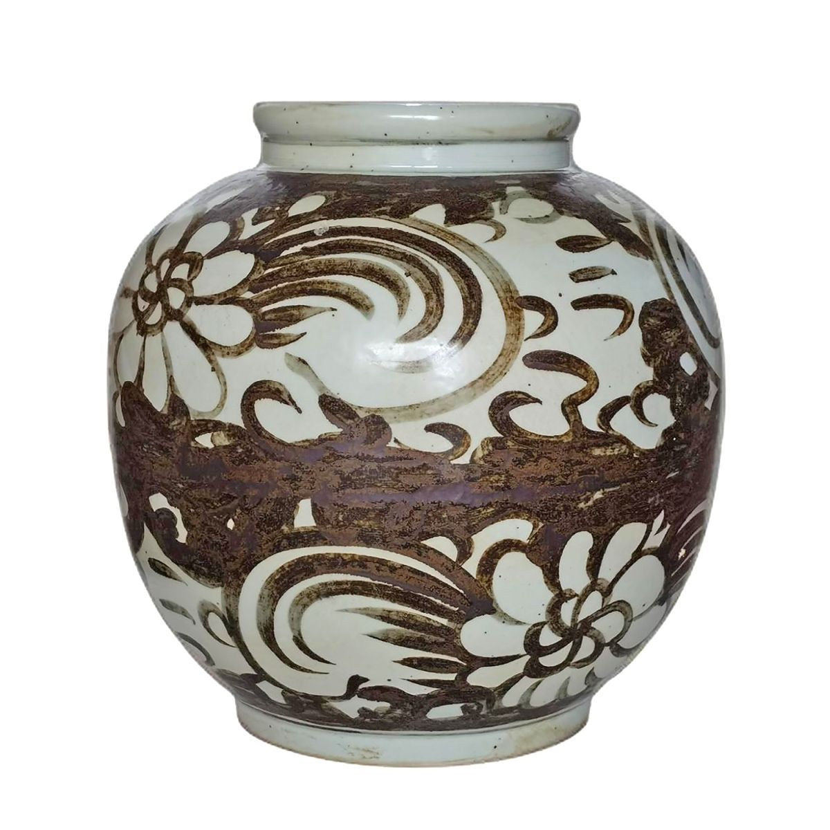 Bring a timeless charm to your space with this hand-painted porcelain vessel featuring an organic brown floral motif layered over a soft ivory glaze. Its rounded silhouette and rustic detailing add depth and character, making it a refined decorative accent for shelves, consoles, or tabletop styling.