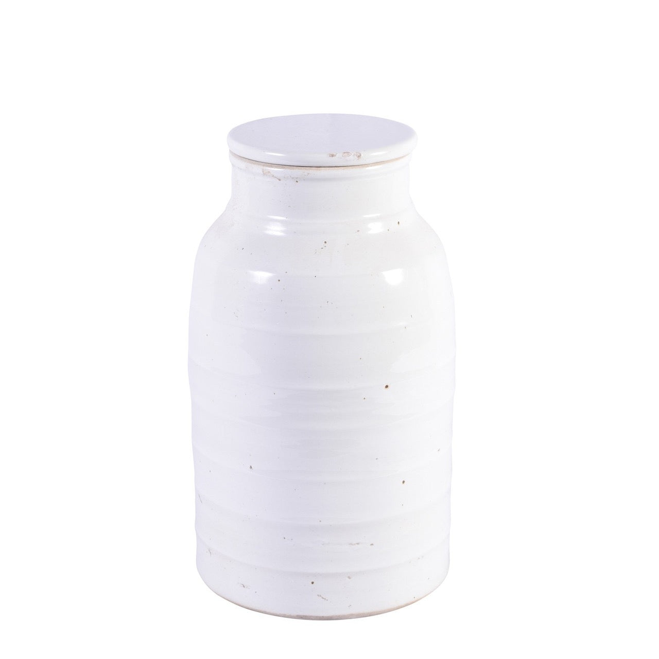 Add a touch of refined simplicity to your kitchen or living space with this minimalist white stoneware jar. Featuring a sturdy, cylindrical body with horizontal ribbed texture and a flat-topped lid, this handcrafted ceramic jar offers a beautiful blend of utility and artisan style. Its clean, off-white glaze with subtle organic speckling makes it an ideal decorative storage accent for those who appreciate modern farmhouse and rustic minimalist aesthetics.