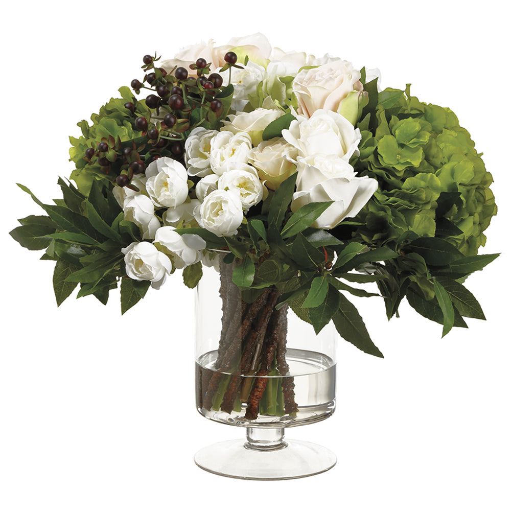 A full ranunculus and rose arrangement in soft blush tones. Designed with layered ranunculus and rose blooms, this arrangement brings a soft, romantic presence to any space. The glass pedestal vase elevates the overall look, making it perfect for statement styling on consoles or coffee tables.