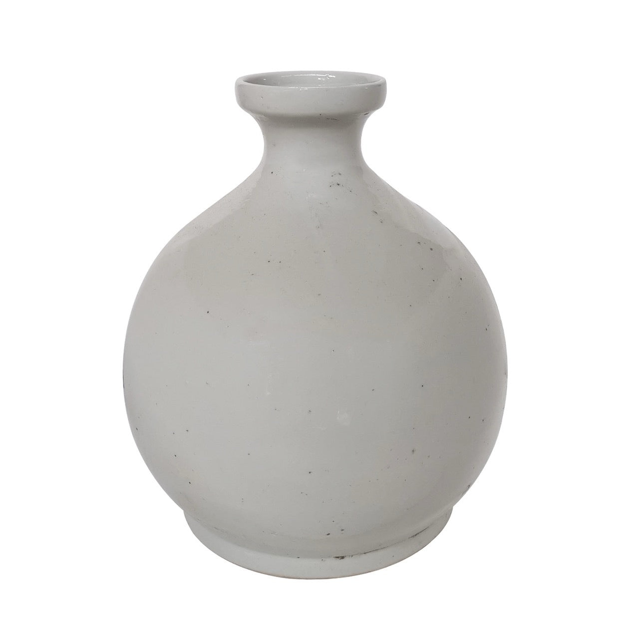 Add a touch of serene, understated elegance to your home with this minimalist white stoneware bud vase. Featuring a classic globular body and a narrow tapered neck, this handcrafted ceramic piece showcases a subtle, off-white glaze with organic speckling for a truly authentic look. Its simple, rounded silhouette makes it a perfect tabletop accent or shelf decor for those who appreciate modern minimalist aesthetics.