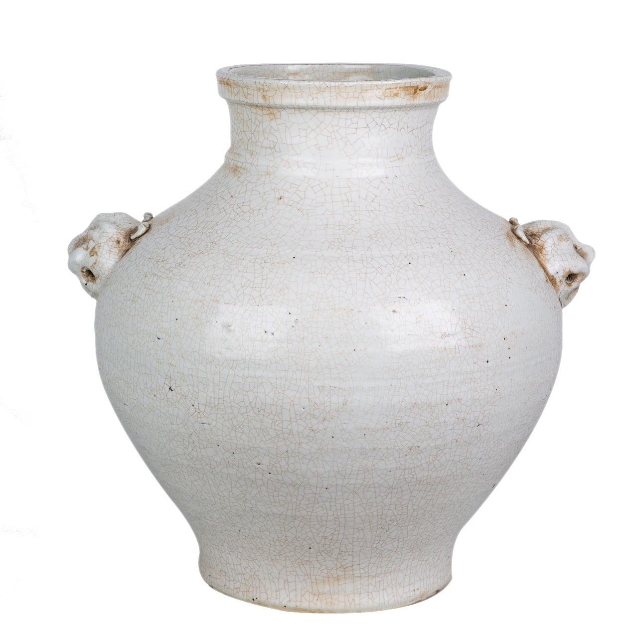 Hand-glazed with a vintage-inspired crackle finish, this porcelain vessel is accented with subtle tea-stained distressing that emphasizes its delicate, web-like texture. Its high-shouldered silhouette, paired with two decorative lion-head handles, gives it a stately, collected presence—perfect for mantels, built-ins, or console displays. A sculptural, soulful piece that elegantly marries old-world character with refined modern style.