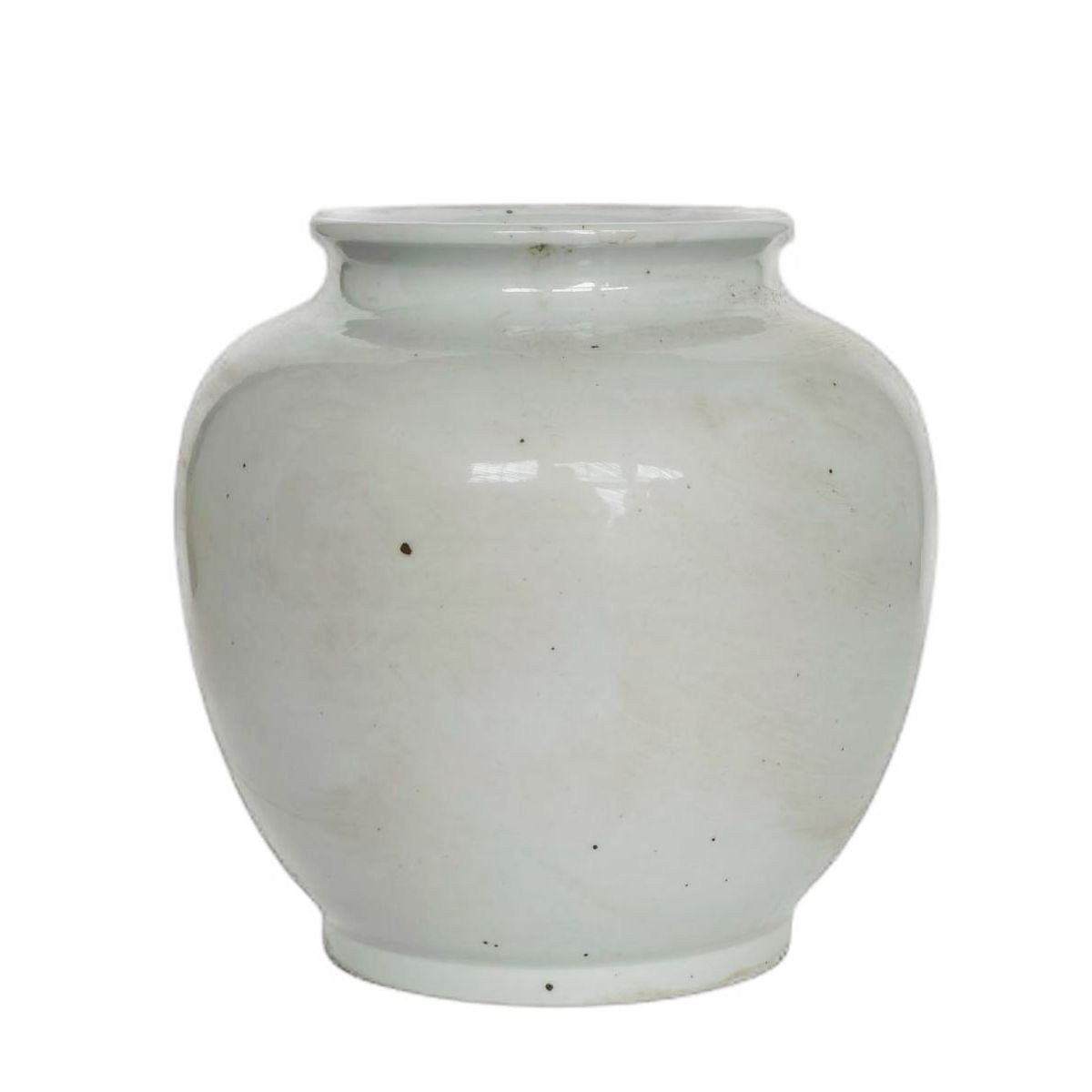 This hand-glazed vessel features a soft, alabaster finish with intentional, aged distressing for an authentic antique feel. Its round, full-bodied shape and simple rim create a calm, collected look that adds character to any shelf, kitchen counter, or tabletop display.