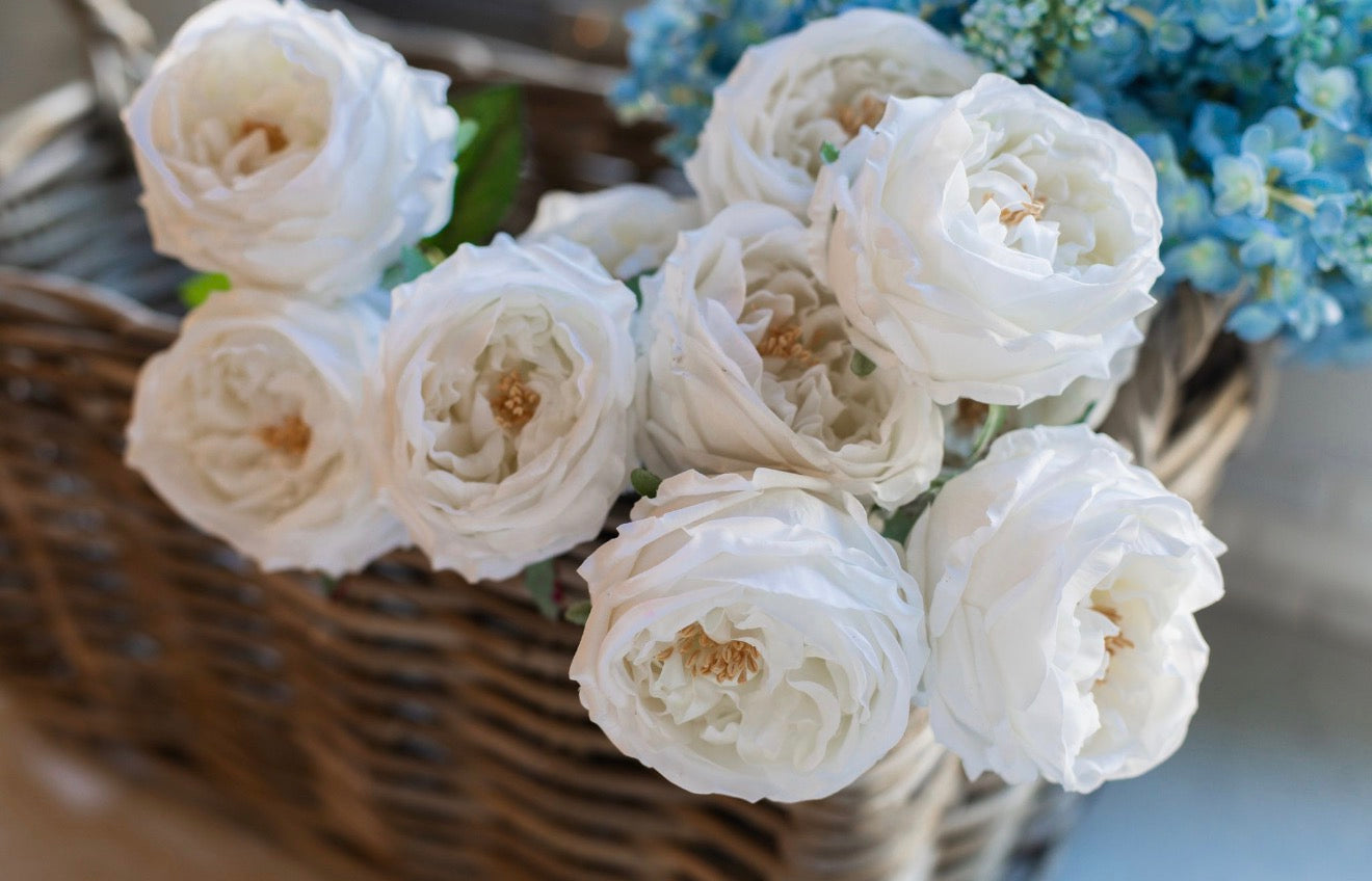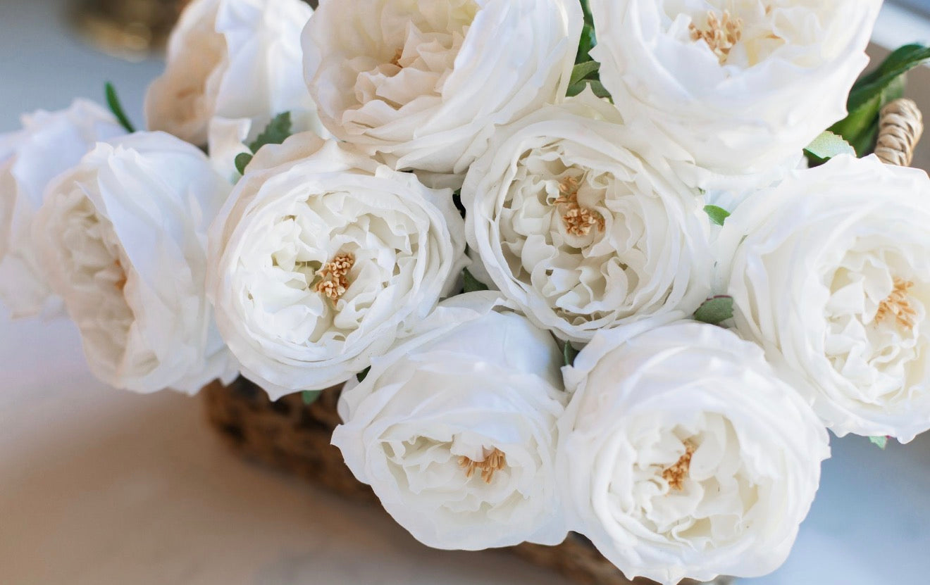 Infuse your space with a sense of soft, vintage charm using our white real touch roses. Modeled after the classic "cabbage rose" silhouette, this stem features an abundance of intricately layered petals in a sophisticated white palette. Each bloom captures the delicate, velvety texture of a natural flower at its peak, providing a romantic and high-end aesthetic that never fades. Designed for the curated home, this lifelike floral accent brings a warm, feminine touch to any tabletop or shelf display.